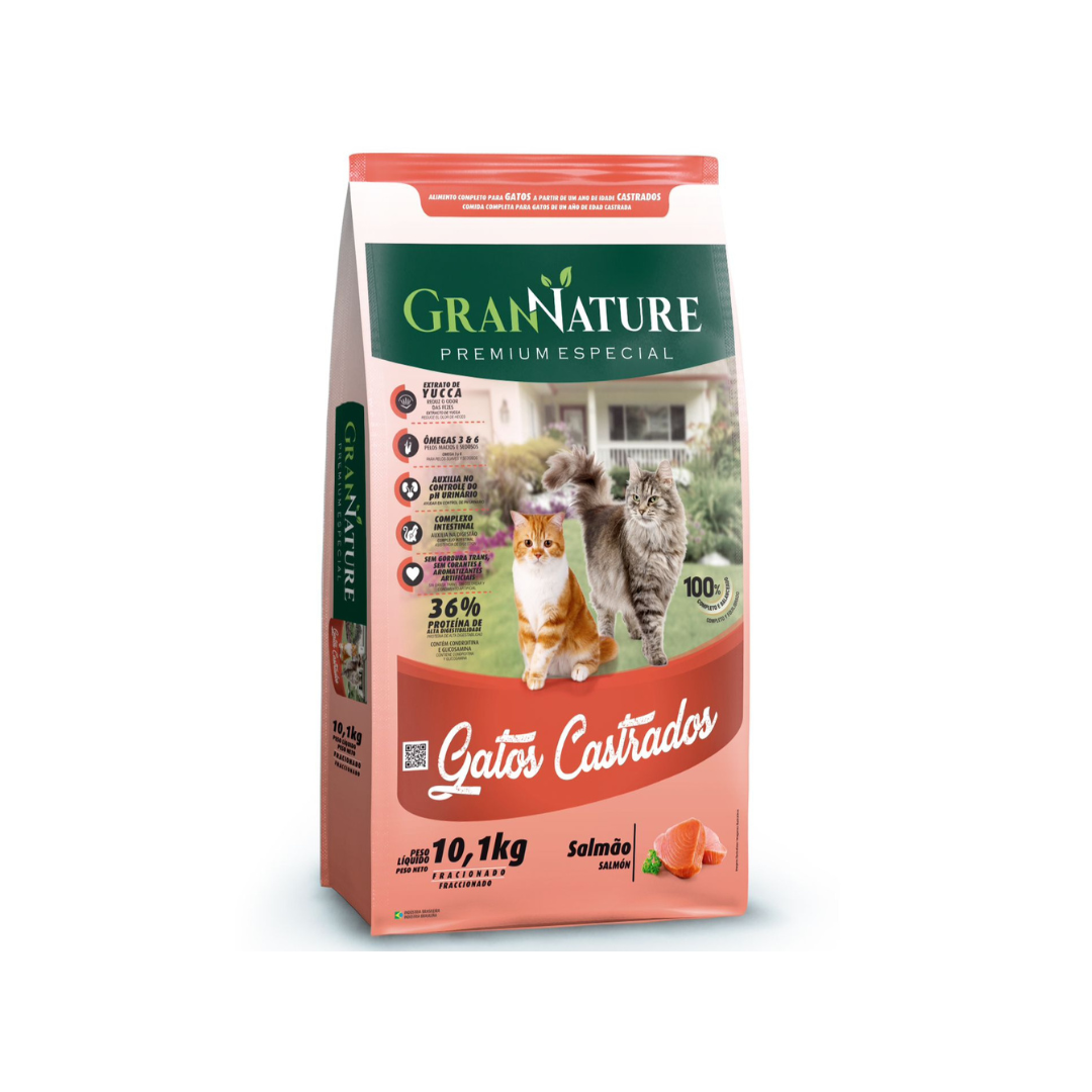 GranNature é um alimento completo, com nutrientes e vitaminas essenciais que proporcionam o melhor desenvolvimento para gatos adultos. Sua formulação contém aditivo regulador de acidez, que regula o pH urinário, evitando a formação de cálculo renal. Devido a sua fórmula, e a composição ser rigorosamente completa e balanceada, não recomendamos nenhum tipo de suplementação